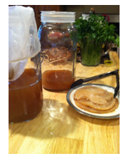 Once you get your scoby safely home remove the lid. Cover the top with cheese cloth or a clean rag and fasten with a rubber band. This will keep in a cool dark place for about 2-5 days. Do not refrigerate.